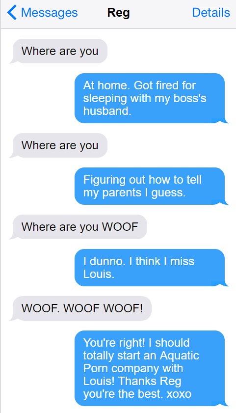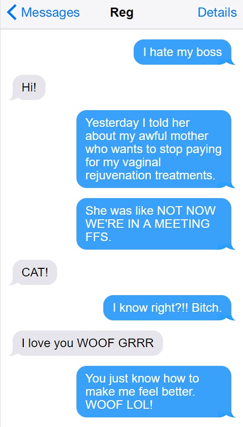 Seriously, I think it’s a dog. Like, an actual dog, who has somehow commandeered a phone and learned to communicate via text using simple English phrases. Again, I don’t know how this all came to pass or how it even works on a purely technical level, but I’m now confident my therapist is, in fact, a German Shepard named Reg. And in my defense, Reg seemed like your normal, standard guy at first.