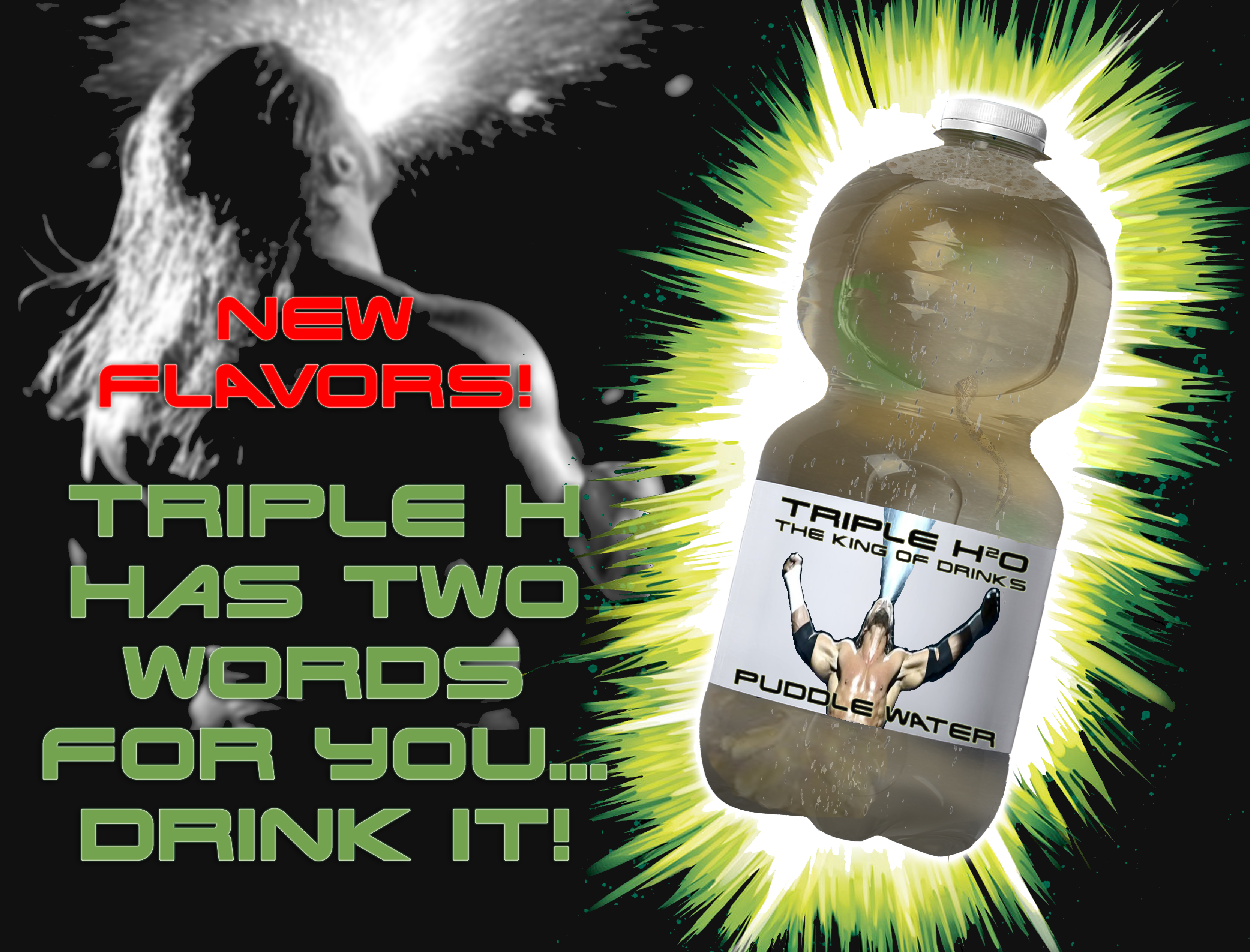 When Triple H needs some extra grit for those tough no holds barred matches, he reaches for his Triple H2O Puddle Water. This isn’t your daddy’s rain water. Each bottle is filled with the highest-quality minerals, rocks, mud, and pesticides that run off from the mean streets and manicured lawns of Greenwich, Connecticut. The thick brown coloring hides a surprise in every bottle. What will it be this time? Glass? The bones of a mouse fetus? Intestinal parasites? It doesn’t matter. If you can down a bottle of Puddle Water, you can survive anything. *DISCONTINUED PRODUCT*